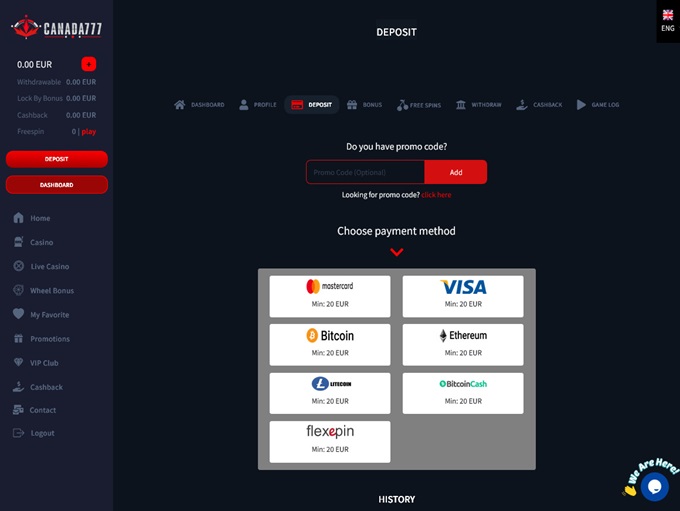 - Депозиты: Interac, Visa, MasterCard, Apple Pay, Google Pay, FlexePin, BTC, ETH, BCH, LTC, оплата кредитной картой для криптовалюты