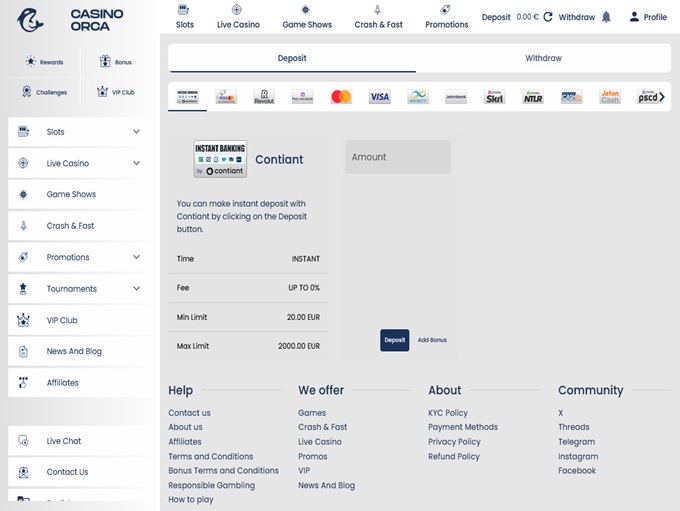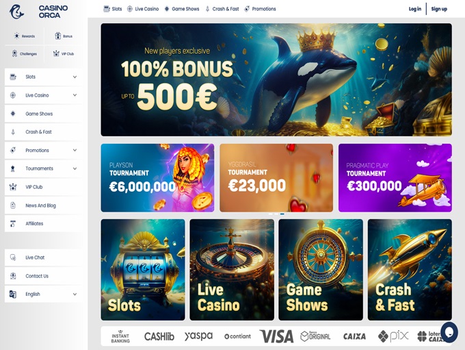 Мой опыт : для канадского игрока процесс регистрации прошёл гладко. Казино Orca поддерживает EN, DE, NO, FR, ES и PT, а также поддерживает канадские доллары, EUR, USD и криптовалюту — отличный вариант для игроков со всего мира.