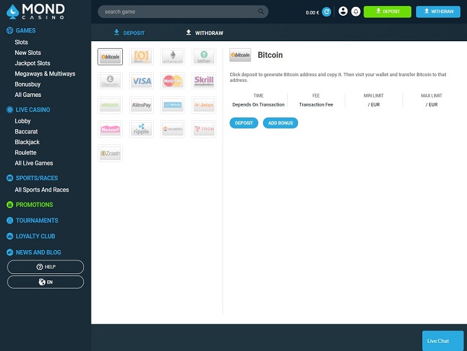 MondCasino предлагает множество способов оплаты как для фиатных, так и для криптовалютных пользователей. Игроки могут использовать Bitcoin, Litecoin, Etehreum, Thron, Ripple, а также Visa, MasterCard и EcoPays для пополнения и вывода средств.
